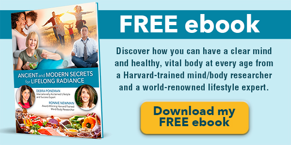 In fact, there are simple steps you can take at any age to ensure lifelong health, vitality and radiance—and my dear friend and lifestyle expert, Debra Poneman along with award-winning, Harvard-trained mind/body researcher, Ronnie Newman, share these steps in their new ebook: Ancient and Modern Secrets for Lifelong Radiance.
